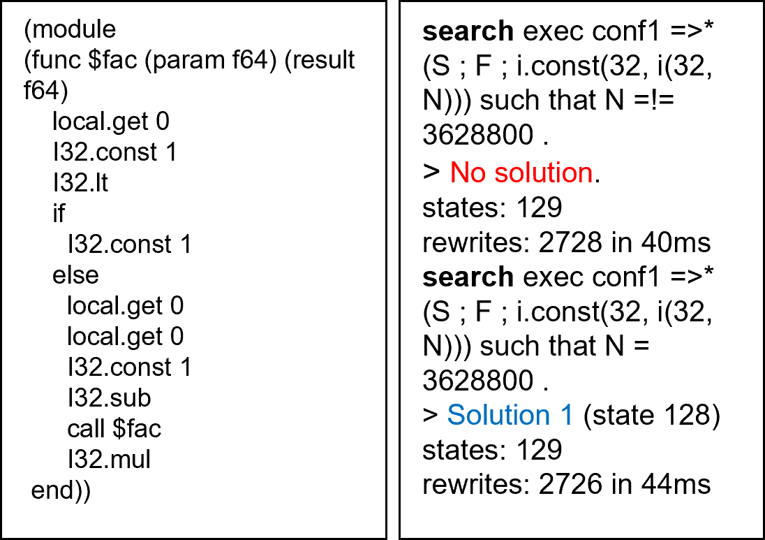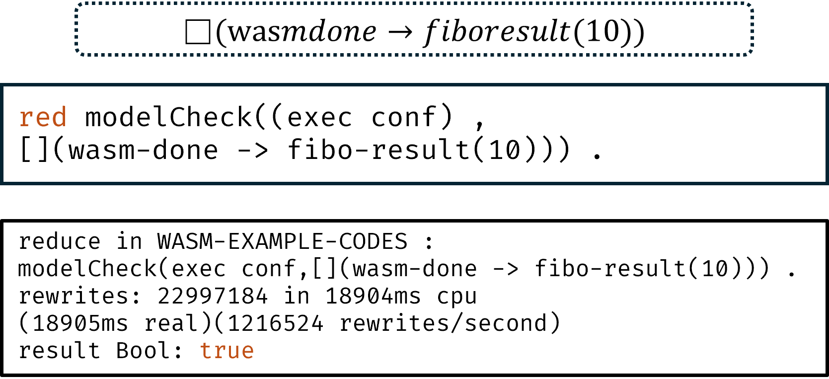 Once we finished testing the Wasm module, we moved on to model checking it. For this Fibonacci example, we set up an atomic proposition to verify the module’s states. We wanted to confirm the property that “whenever the Wasm program finishes, the result is a correct Fibonacci number.” To do this, we built the LTL property you see in the picture. Then, using Maude’s model-check command, we successfully verified this liveness property for our simple Wasm program.